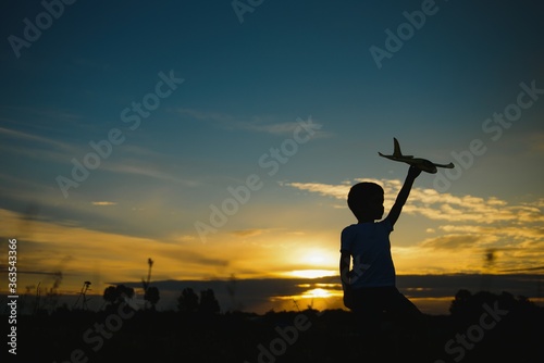 Kid boy playing with toy plane during sunset time. Childhood memories - beautiful sky over meadow. Childhood dream imagination concept