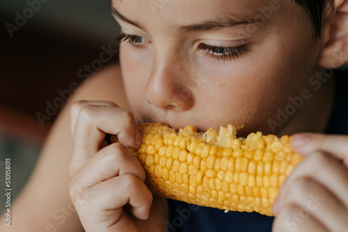 Kid eating corn.