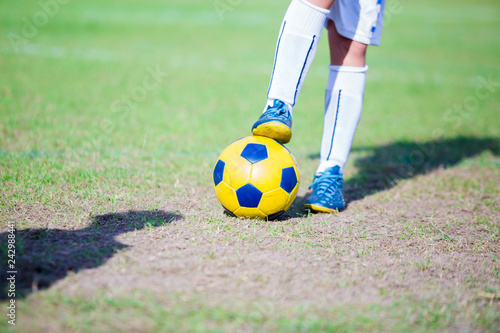 Kid football player standing and stepping on the ball.