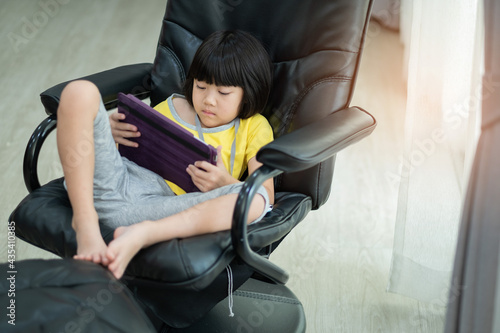 kid is addicted to tablet, little girl playing smartphone, kid use telephone, watching cartoon