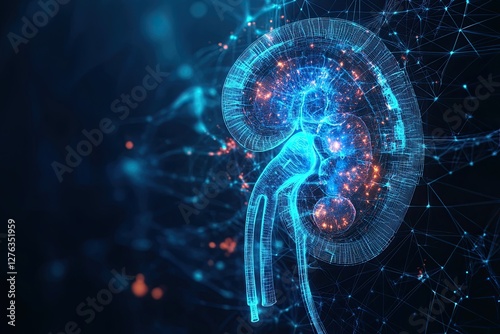 Kidney anatomy. Futuristic glowing organ hologram translucent white and copy space for text.