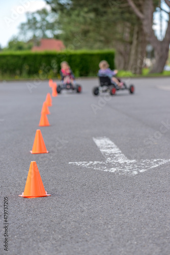 Kids are riding on pedal karting.