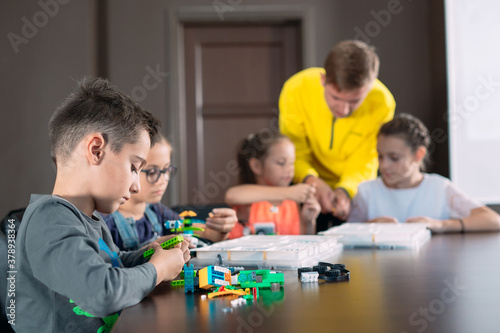 Kids creating robots with teacher. Early development, diy, innovation, modern technology concept.