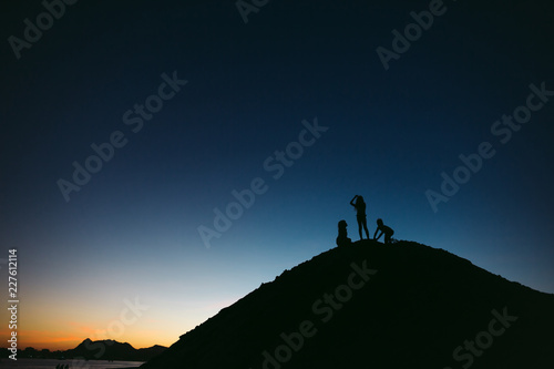 Kids playing on sandy hille dune at sunset