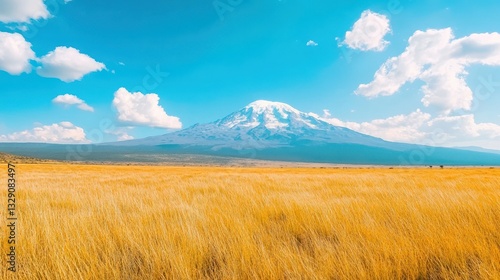 Kilimanjaro's Majesty: Majestic Mount Kilimanjaro rises serenely against a clear blue sky, its snow-capped peak contrasting beautifully with a vast field of golden grass in the foreground.