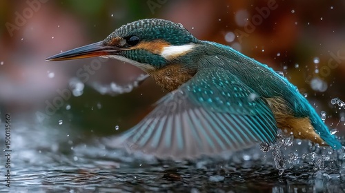 Kingfisher diving, autumn leaves background, water splash, wildlife photography