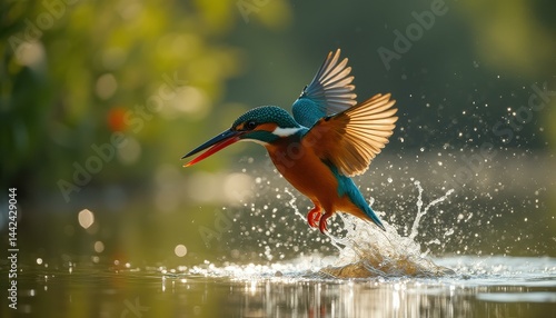 Kingfisher diving into water creating splash effect in blurred nature background featuring feathers, beak, and vivid plumage