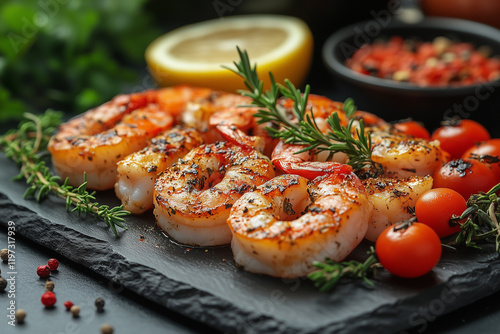 Kitchen board with black stone texture, shrimps, and greenery, dark background