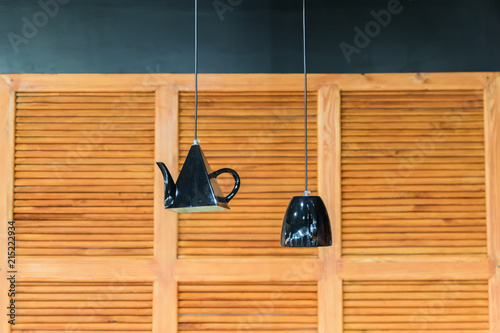 kitchen interior decoration. Lanterns in shape of kettle and cup on wooden panel wall background