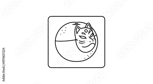 Kitsune Mask on a Round Object with Dots, Minimalist Line Art Icon