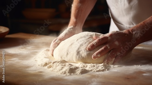 kneading lump of white dough in a bakery with his two hands in high quality