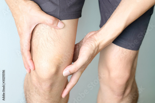 Knee pain .man stand hand caught at the knee. Having painful feet and stretching muscles fatigue To relieve pain. health concepts