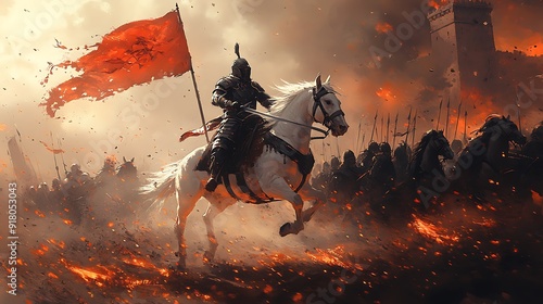 Knight on Horseback Leading Army into Battle with Red Flag