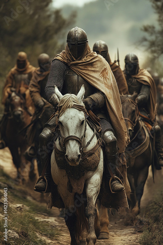 Knights in armor ride on horseback during a crusade through a dense forest landscape