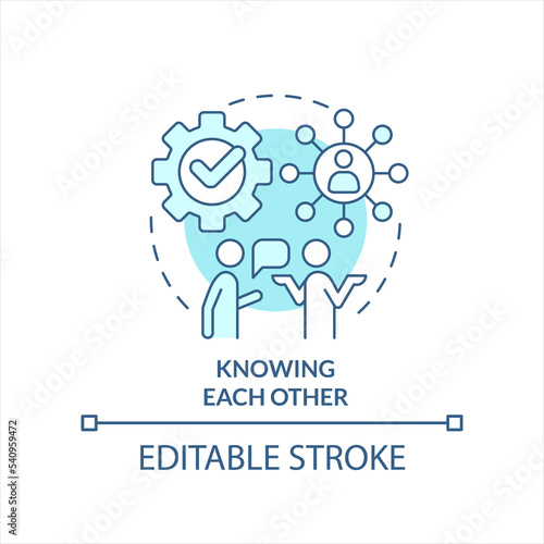 Know each other turquoise concept icon. Build workplace relationship tip abstract idea thin line illustration. Isolated outline drawing. Editable stroke. Arial, Myriad Pro-Bold fonts used