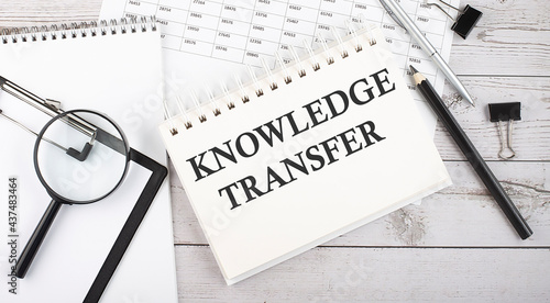 KNOWLEDGE TRANSFER . Text written on notepad with office tools and documents.