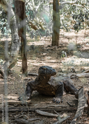 Komodo Island, Indonesia - February 24, 2019: Komodo National Park. Komodo Dragon on the move in the wild among trees, raising his head. Green foliage in back.