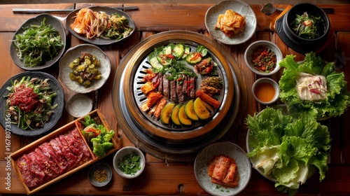 Korean Barbecue Table with Various Dishes from Bird's Eye View