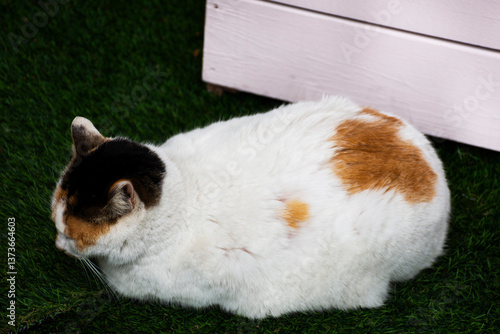 Korean domestic fat cats sleeping in plastic grass floor in Gamcheon Culture Village or Santorini of Pusan city at Busan, South Korea