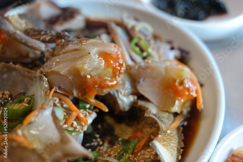 Korean traditional food eaten with fresh live crab seasoned with soy sauce