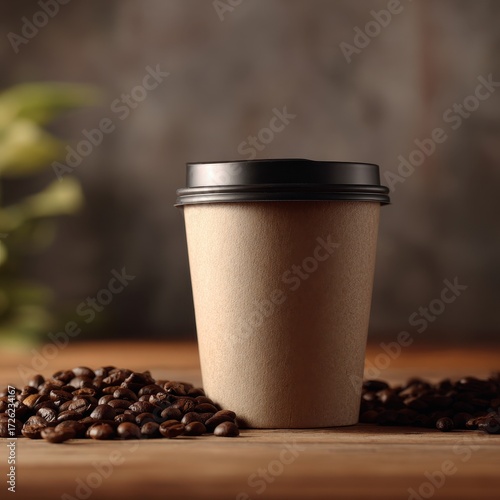 Kraft Paper Coffee Cup with Black Lid, Coffee Beans, Warm Lighting, Still Life.