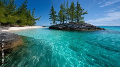 Kristallklares türkises Wasser mit kleiner bewaldeter Insel und dramatischem Himmel in tropischer Idylle