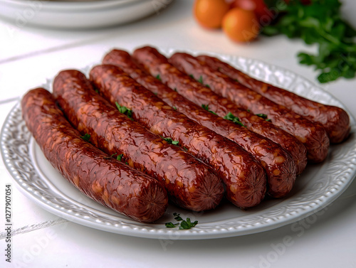 Kuban Sausage bold garlic and pepper flavor with a smoky finish deep reddish-brown casing with a slightly wrinkled