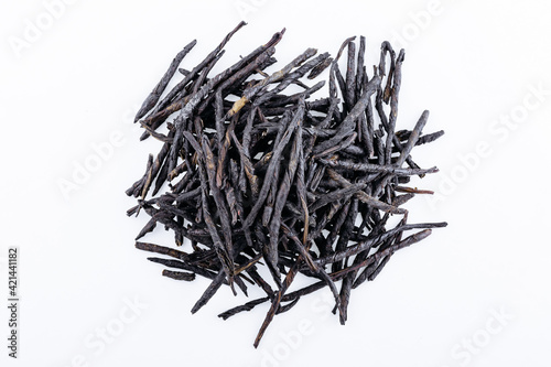 Kudin - Twisted Leaves of Ilex Latifolia Kudingcha. Bitter Chinese Green Tea. Close up. High resolution.