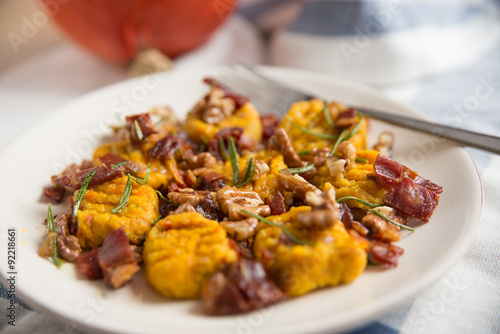 Kürbis Gnocchi mit Speck und Nüssen