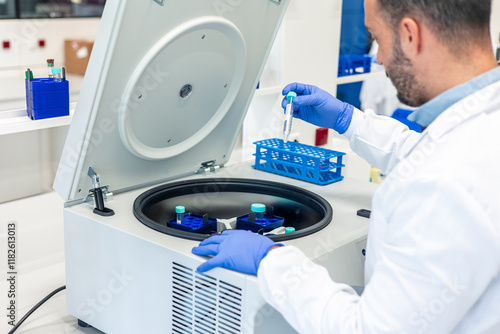 Lab technician preparing samples for analysis using laboratory centrifuge