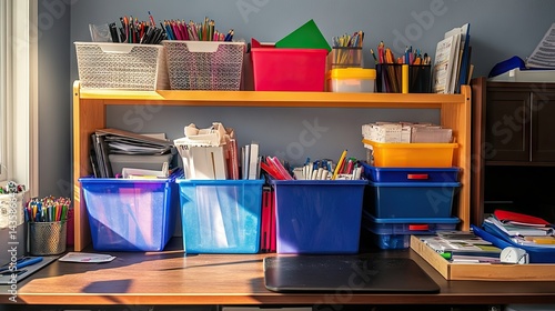 Labeled plastic bins on a storage rack containing categorized office supplies