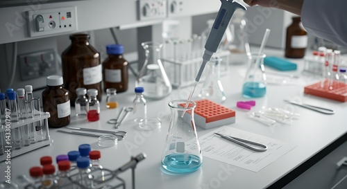 Laboratory Bench: Researcher Pipetting Blue Liquid into Flask Amidst Glassware and Vials.