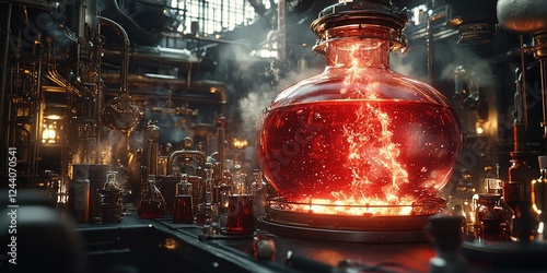 Laboratory in an old building showcasing a large glass vessel with bubbling red liquid and steam rising during late evening hours