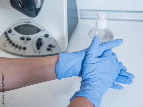 Laboratory professional washing hands in gloves with hydroalcoholic gel