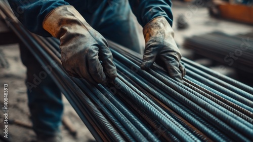 Laborer stacking steel bars at a construction site. Featuring strength and focus