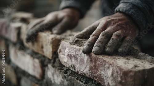 Laborers laying bricks on a wall structure with manual labor lighting and sharp focus