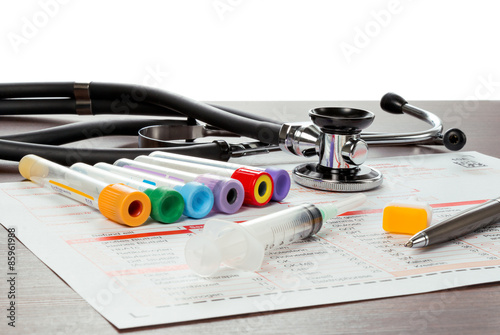 Laborzettel und Utensilien für die Blut Untersuchung
