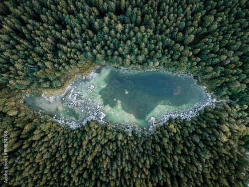 Lake Eibsee in south Germany with large forest and hidden lakes after sunset