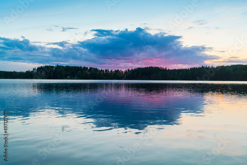 Lake reflecting clouds at sunset