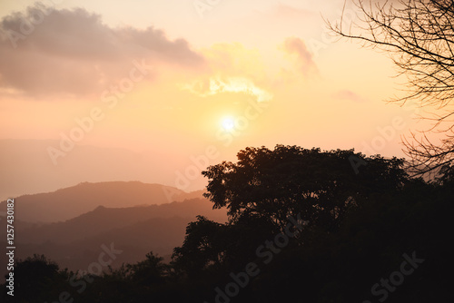 landscape and travel concept with sunrise and layer of mountain and mist with forest on morning