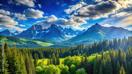 Landscape featuring a vibrant blue sky and majestic forested mountains, nature, scenery, outdoors, panoramic, tranquil