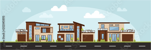Landscape of awesome Vector Flat Illustration modern houses, family home, office building, private apartment, beauty architecture for dream houses urban city brown style