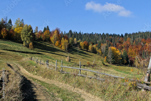 Landscape of mountain autumn village. Hill with wild road with a fence. Colorful forest. Countryside in the fall time. Background of the Carpathian mountains in the Ukraine. Orange forest.
