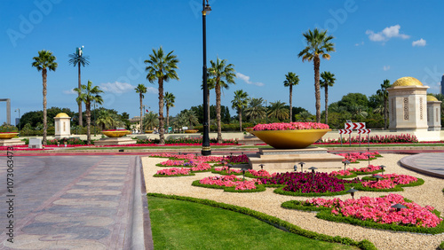 Landscape park at Sheikh's Palace in Dubai, United Arab Emirates. Lawn with pink petunia and green lawn in landscaping, entrance arch with horses at entrance to ruler's residence