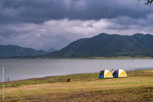 Landscape view of nature Camping tents near river lake with mountain range and dramatic clouds sky background in rainy season Thailand.