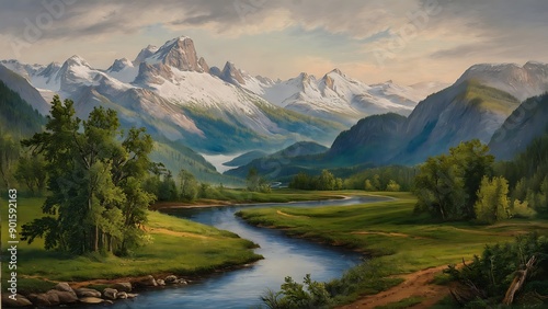 Landscape wallpaper design, oil painting, mountain and trees, mural art