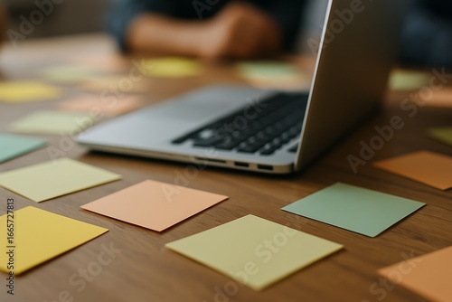 Laptop and colorful sticky notes on a wooden table for brainstorming
