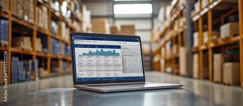 Laptop computer with analytics data on the screen in front of a warehouse aisle.