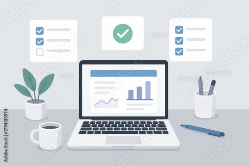 Laptop displaying analytical graphs and checklists, symbolizing productivity and organization in a remote working environment. Concept of digital management and efficiency in modern workflows.