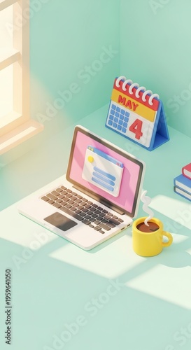 Laptop on desk with calendar coffee.